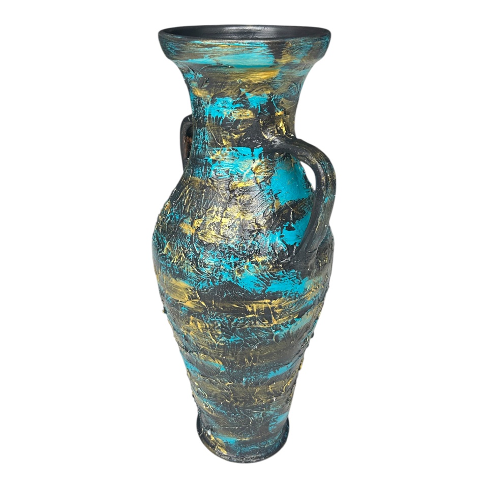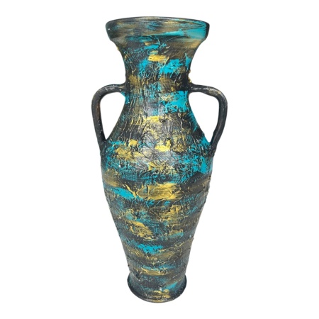 Amforă decorativă din ceramică, realizată manual și pictată în nuanțe de turcoaz și auriu, cu o textură deosebită în relief, asemănătoare unor mici tepi. Cu cele două mânere laterale și forma impunătoare de 44 cm înălțime, această piesă adaugă eleganță și rafinament oricărui spațiu. Perfectă ca obiect central de decor sau amplasată lângă mobilier clasic ori modern.