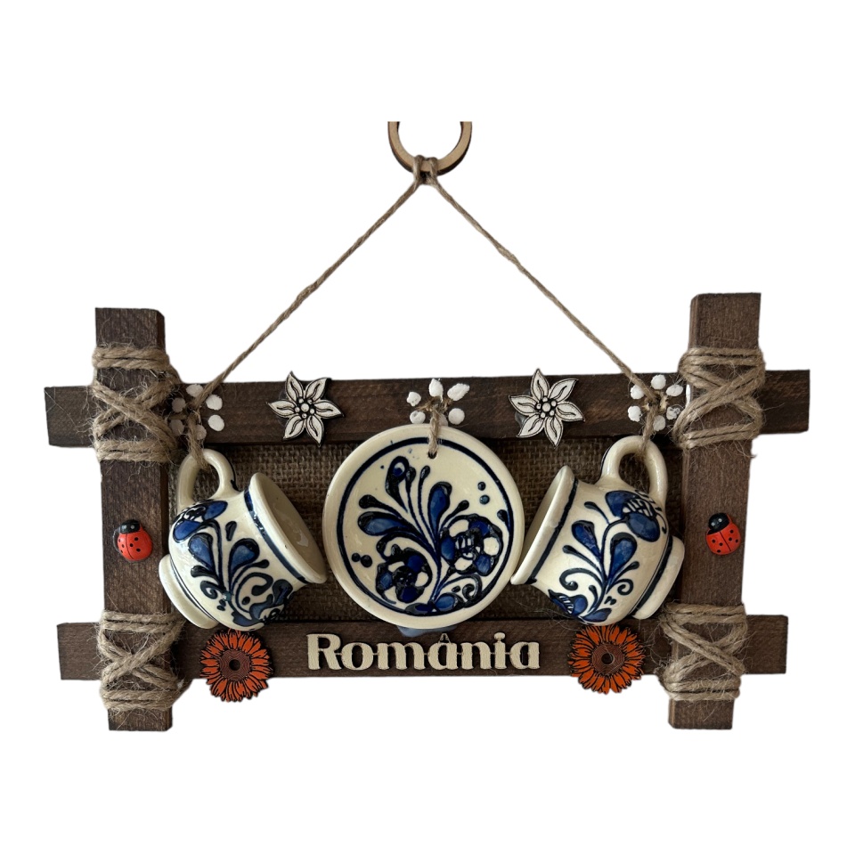 Aplica de perete realizata din cadru de lemn, panza si miniaturi din ceramica realizate si pictate manual.