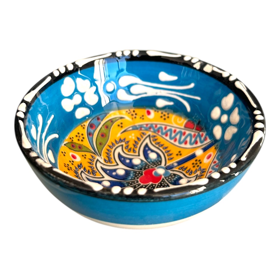 Acest bol mic din ceramică pictată manual impresionează prin nuanța albastru deschis, luminoasă și delicată, care conferă un aspect aerisit și elegant. Decorul floral central este realizat cu atenție la detalii, folosind tonuri armonioase de galben, roșu, verde și alb, care contrastează subtil cu fundalul deschis și evidențiază finețea picturii manuale.