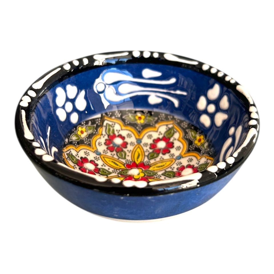Acest bol mic din ceramică pictată manual se remarcă prin nuanța albastru închis, profundă și elegantă, care oferă un aspect sofisticat și bine definit. Decorul floral central, realizat manual cu atenție la detalii, combină armonios nuanțe de galben, roșu, verde și alb, creând un contrast puternic și echilibrat cu fundalul închis.