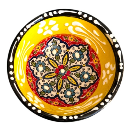 Acest bol mic din ceramică pictată manual se remarcă prin culoarea galben cald, luminoasă, care adaugă energie și eleganță oricărui decor. Motivul floral central, realizat cu atenție la detalii, este pus în valoare de contrastele armonioase dintre nuanțele de roșu, verde, alb și accente fine de albastru. Decorul este completat de marginea ornamentată manual, care conferă profunzime și unicitate fiecărei piese.