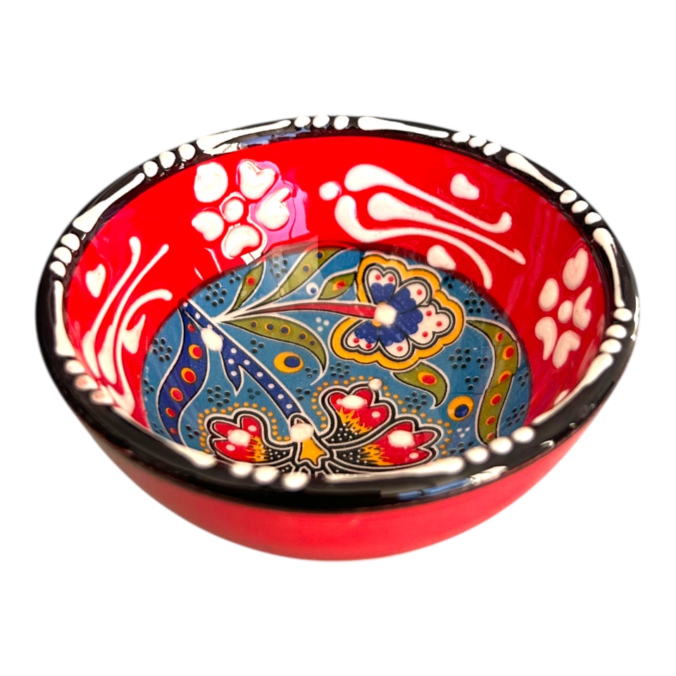 Acest bol mic din ceramică pictată manual atrage atenția prin culoarea roșu intens, vibrantă și expresivă, care conferă personalitate și energie fiecărui decor. Decorul floral central, realizat cu precizie și echilibru cromatic, combină armonios nuanțe de galben, verde, alb și accente fine de albastru, creând un contrast plăcut și bine definit.