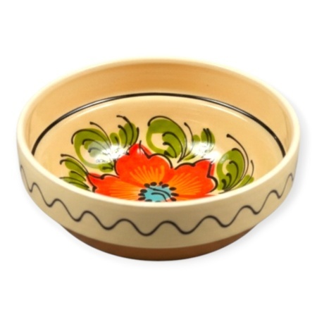 Motivul floral simbolizeaza legatura cu natura si traditia, fiecare bol fiind o piesa unica, realizata prin mestesug ceramic autentic. Este ideal pentru mesele in familie, pentru servire traditionala sau ca obiect decorativ in bucataria romaneasca.