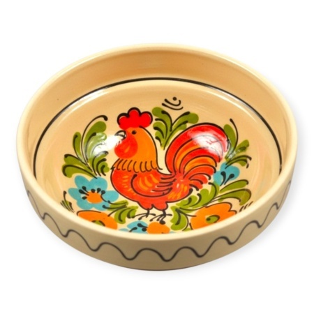 Bol traditional romanesc din ceramica, cu diametrul de 16 cm, realizat prin tehnici de mestesug autentic si pictat manual cu motiv de cocosi, simbol al vietii rurale si al traditiei romanesti. Fundalul crem pune in valoare decorul pictat, oferind un aspect cald si natural, potrivit pentru mesele traditionale.
