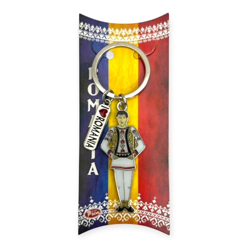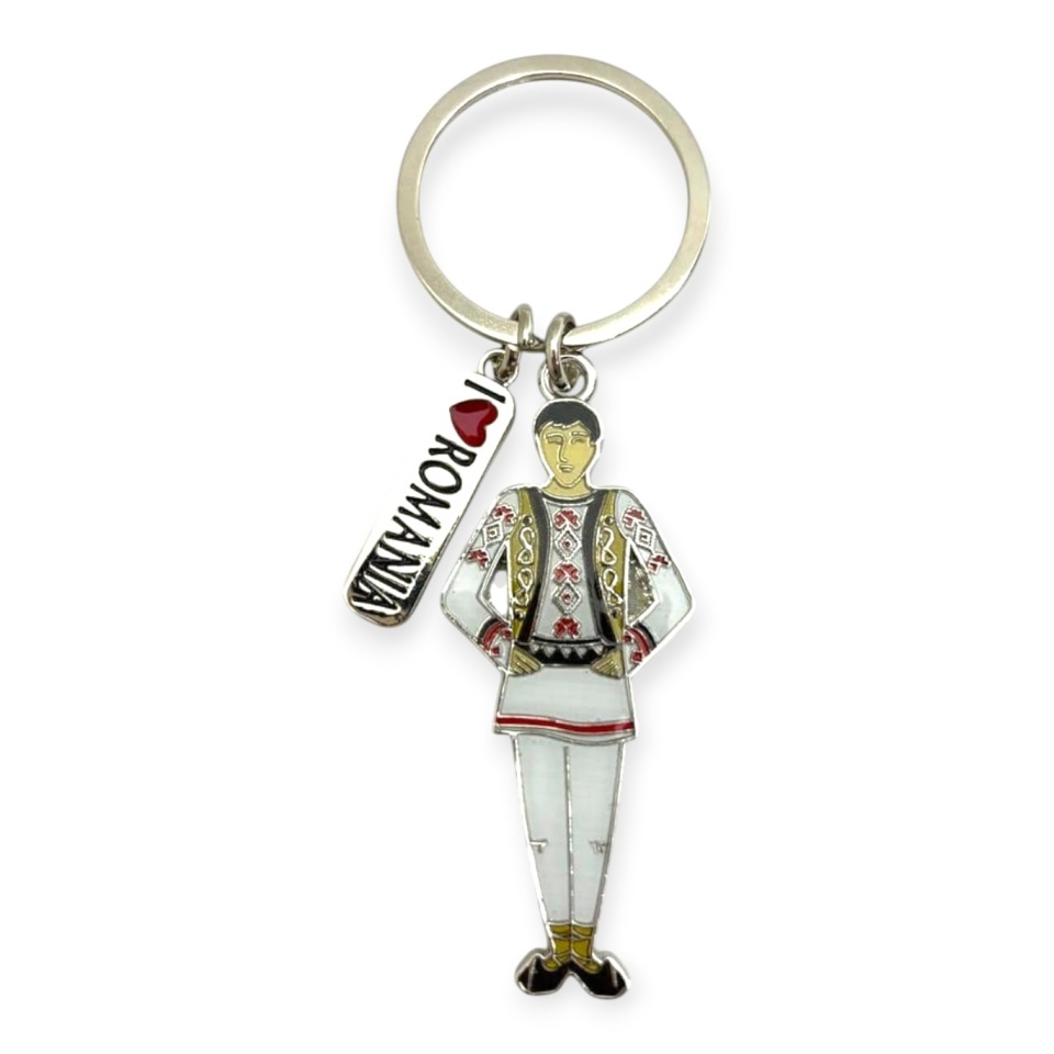 Breloc metal I love România – bărbat în port tradițional, cadou gata ambalat