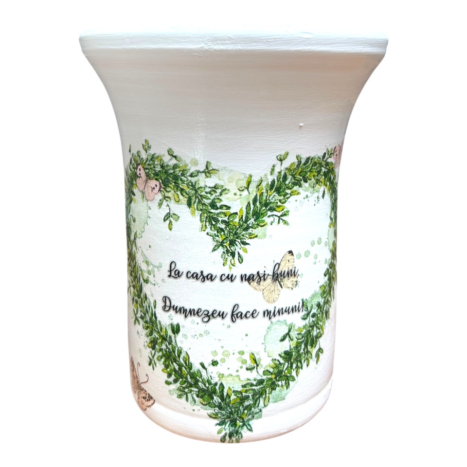 Această vază ceramică de 20 cm este lucrată manual și finisată într-un alb elegant, ce pune în valoare detaliile decorative. În centrul compoziției se află o inimă verde, simbol al recunoștinței și legăturilor sincere, în interiorul căreia este inscripționat mesajul cu valoare sufletească:
