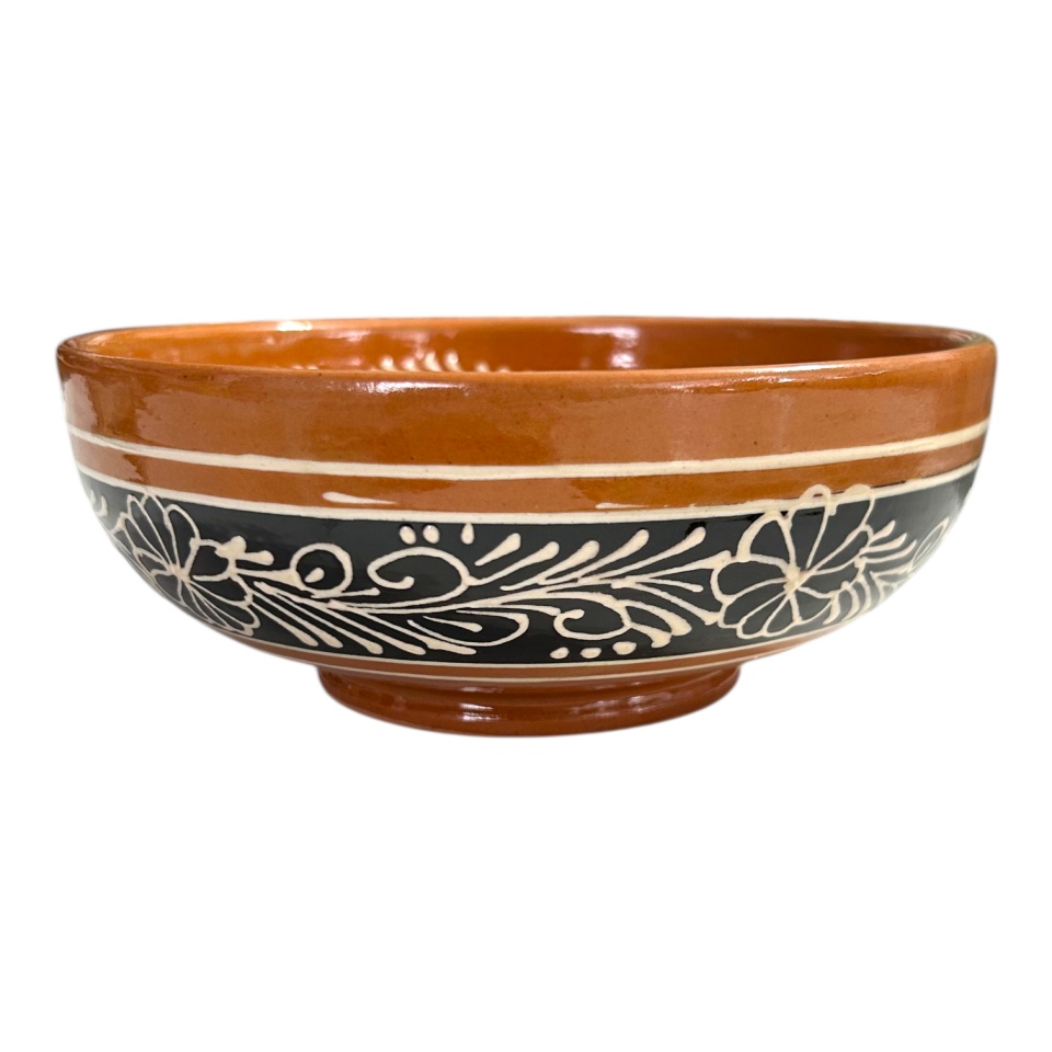 • Castron din ceramică maro, glazurat și decorat manual, ideal pentru servirea salatelor, fructelor sau preparatelor la masă.