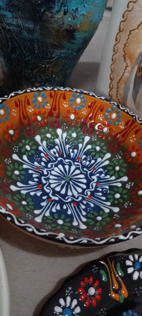 Fiecare piesa este unicat, cu modele diverse, si veti primi culorile si decorul la intamplare. Castronul este lucrat manual, cu motive traditionale in relief, oferind un aspect rustic si elegant in acelasi timp.