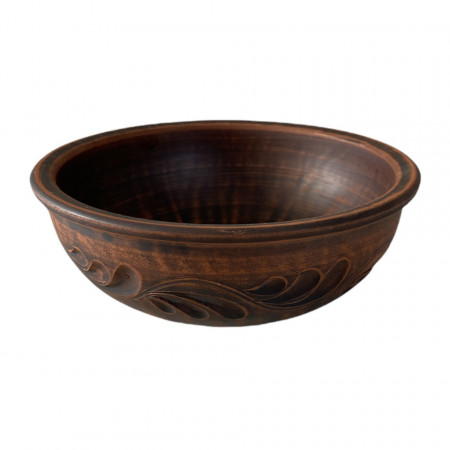 Castronelul din ceramică maro este lucrat și decorat manual, fiind realizat din lut natural, fără glazură, cu un design sculptat pe exterior ce oferă un aspect rustic și tradițional. Fiecare piesă este unică, cu mici variații de textură și nuanță, specifice ceramicii artizanale.