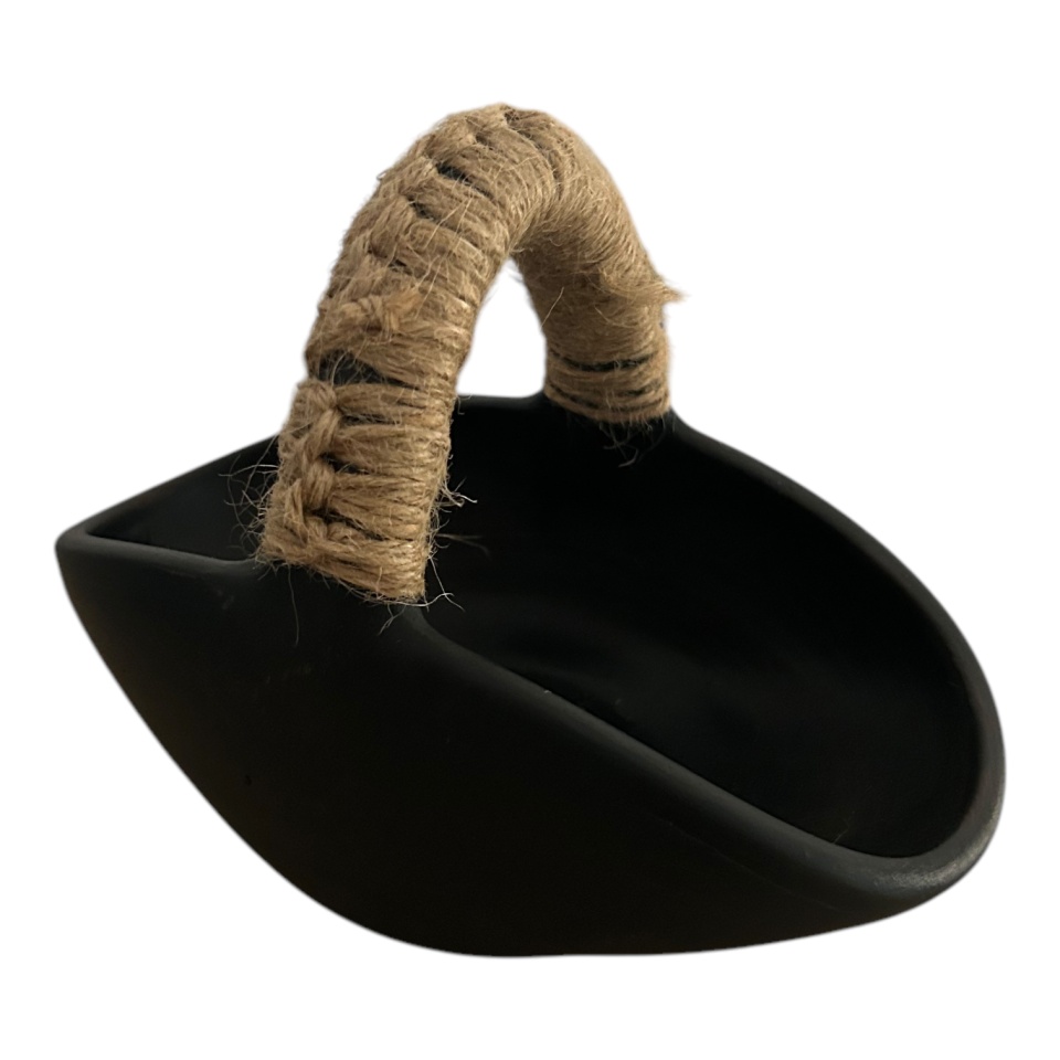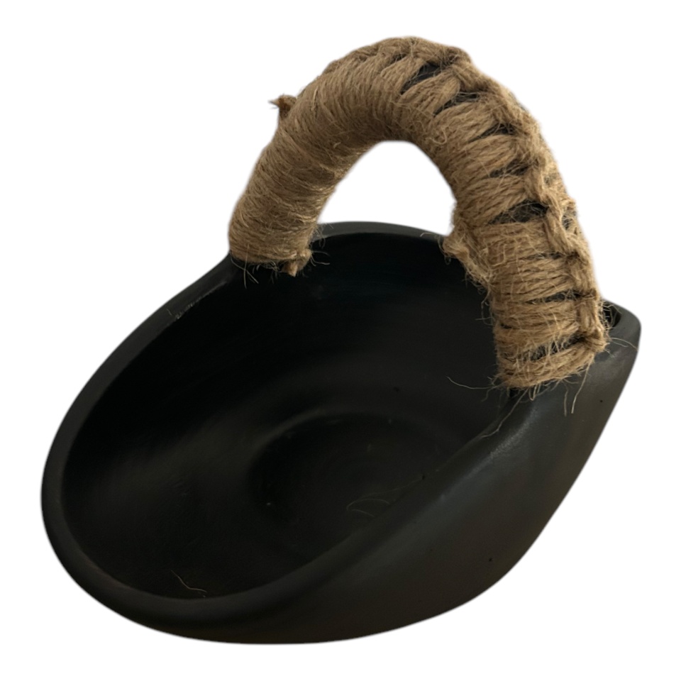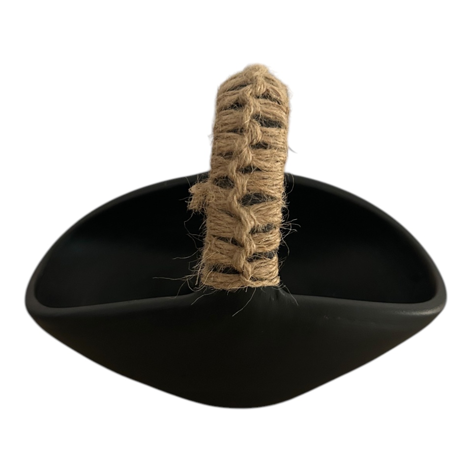 Cosulet ceramic realizat manual în Bucovina o piesă unică, confecționată din ceramică neagră și decorată cu un mâner împletit cu sfoară naturală. Designul său rustic și minimalist îl face potrivit atât ca element decorativ, cât și ca suport pentru diverse accesorii, oferind o notă de autenticitate oricărui spațiu.