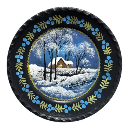 Îmbogățește-ți decorul cu această farfurie decorativă din Ceramica de Marginea, pictată manual. Scena surprinde un peisaj de iarnă liniștit: o casă în depărtare, înconjurată de câțiva copaci acoperiți de zăpadă, evocând atmosfera calmă și pitorească a satului în sezonul rece.