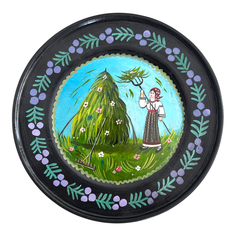 Această farfurie decorativă din ceramică, pictată manual, surprinde o scenă autentică din viața de la sat. O femeie îmbrăcată în port popular ține în mâini o furcă și o greblă, lângă o grămadă mare de iarbă verde, proaspăt cosită. Peisajul este viu și luminos, cu detalii care redau atmosfera unei zile de vară în care munca se împletește cu liniștea naturii.
