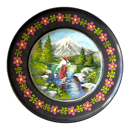 Farfurie decorativă 30 cm pictată manual – țărancă cu găleata la râu, ceramică tradițională Marginea