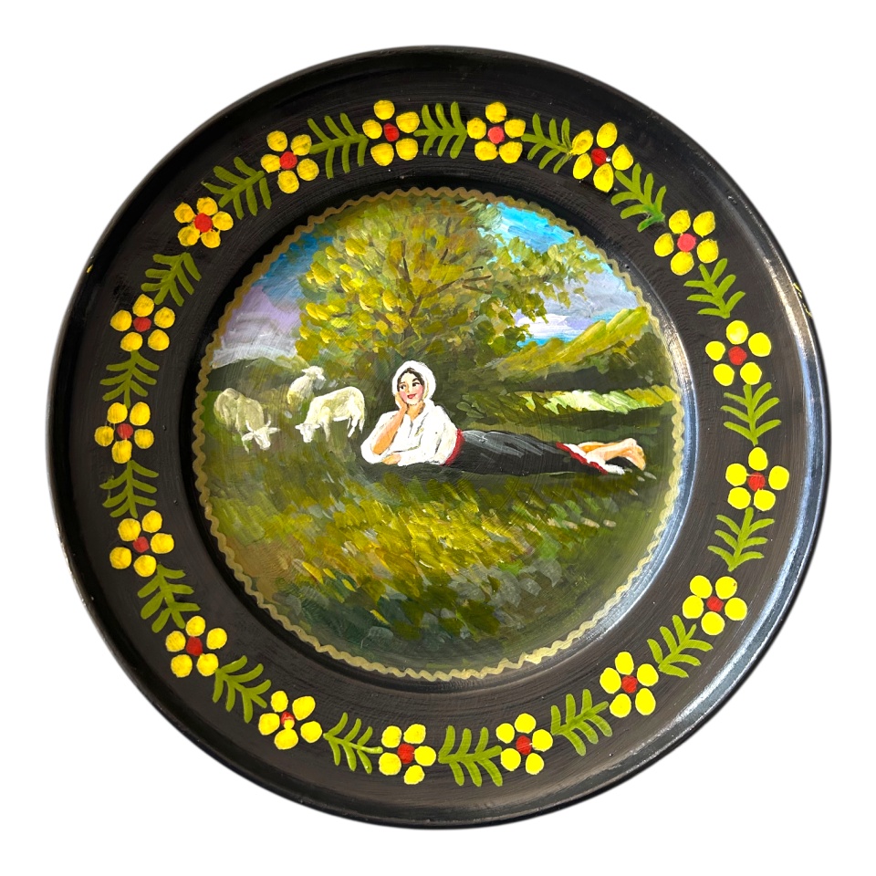 Farfurie decorativă 30 cm pictată manual – țărăncuță cu turma de oi după Nicolae Grigorescu, ceramică tradițională Marginea