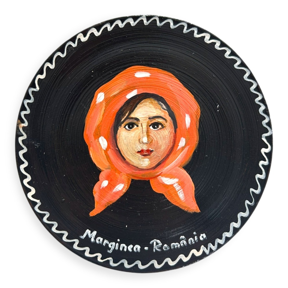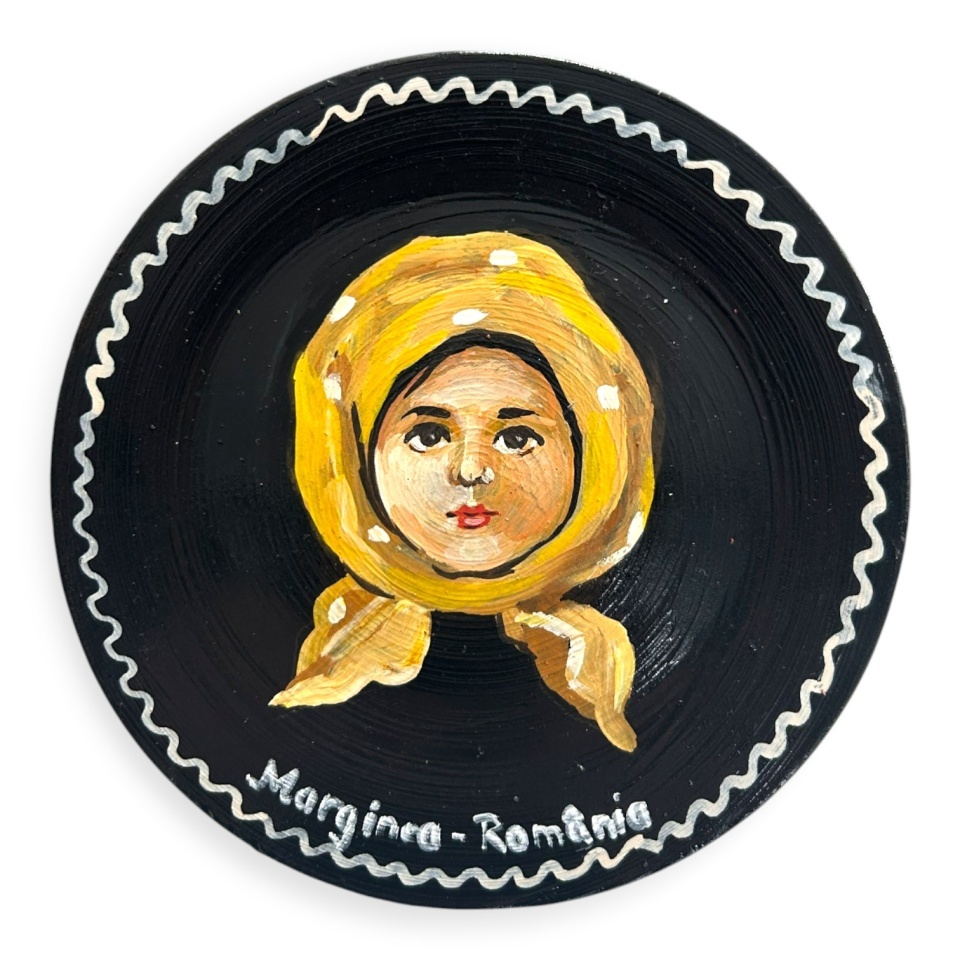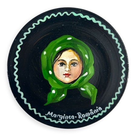 Aceasta farfurie decorativa traditionala din ceramica de Marginea, pictata manual cu chip de taranca purtand batic, este o piesa autentica de artizanat romanesc, realizata in stilul specific Martinescu – Marginea.