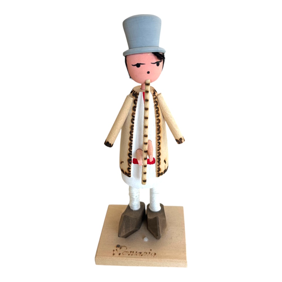Figurină cioban cu fluier din lemn de tei, pictată manual – 16 cm