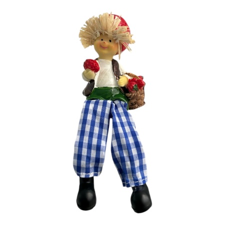 Adaugă un strop de veselie rustică în decorul tău cu această figurină adorabilă a micuțului fermier! Îmbrăcat în pantaloni cu model tradițional și purtând o pălărie din paie, fermierul ține în mână o căpșună coaptă și are un coș plin de fructe delicioase.