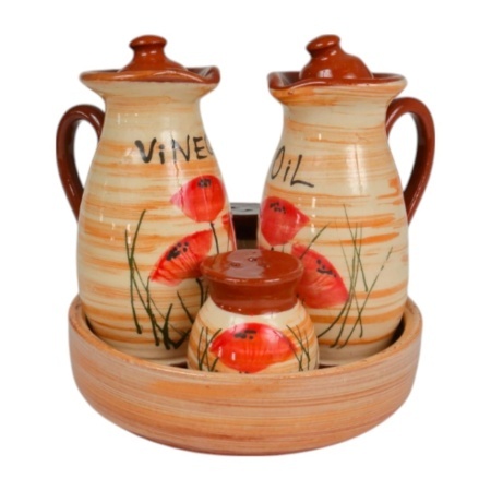 Olivieră,suport condimente din ceramică pictată manual cu maci– set 5 piese pentru ulei, oțet, sare și piper