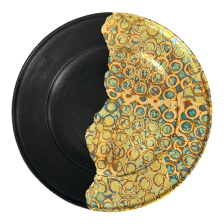 Platou din ceramică lucrat manual, cu diametrul de 30 cm, realizat într-un finisaj negru elegant, decorat cu foiță de aur aplicată artistic pe margine. Designul rafinat și detaliile atent lucrate îl transformă într-o piesă deosebită, ideală atât pentru decor, cât și pentru servirea prăjiturilor, deserturilor sau gustărilor speciale. Fiecare platou este unic, evidențiind farmecul obiectelor artizanale și adăugând un plus de stil oricărui interior sau eveniment.
