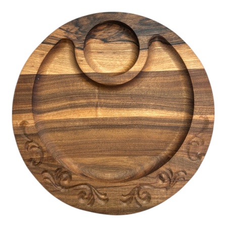 Transformă fiecare masă într-o experiență autentică cu acest platou rotund din lemn de nuc, creat pentru servire elegantă și practică. Piesa are un design unic, cu un spațiu special pentru sosuri, dip-uri sau condimente și o zonă principală generoasă pentru brânzeturi, aperitive sau friptură. Sculptura decorativă adaugă rafinament, făcând platoul ideal atât pentru uz zilnic, cât și pentru ocazii speciale. Lemnul de nuc este durabil, rezistent și aduce un aspect cald, natural, care se potrivește în orice bucătărie sau dining modern. Perfect ca platou de servire, platou pentru aperitive sau cadou deosebit pentru pasionații de gastronomie.