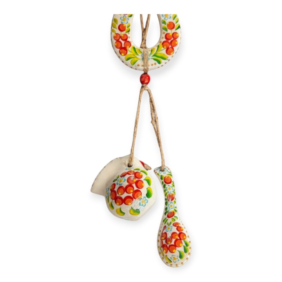 Aceasta potcoava din ceramica este pictata manual cu miniaturi si reprezinta un element decorativ unic, potrivit pentru pereti interiori sau exteriori. Cu o dimensiune de 29 cm, se remarca prin designul atent lucrat si culorile vibrante, aducand un plus de personalitate si autenticitate oricarui spatiu.