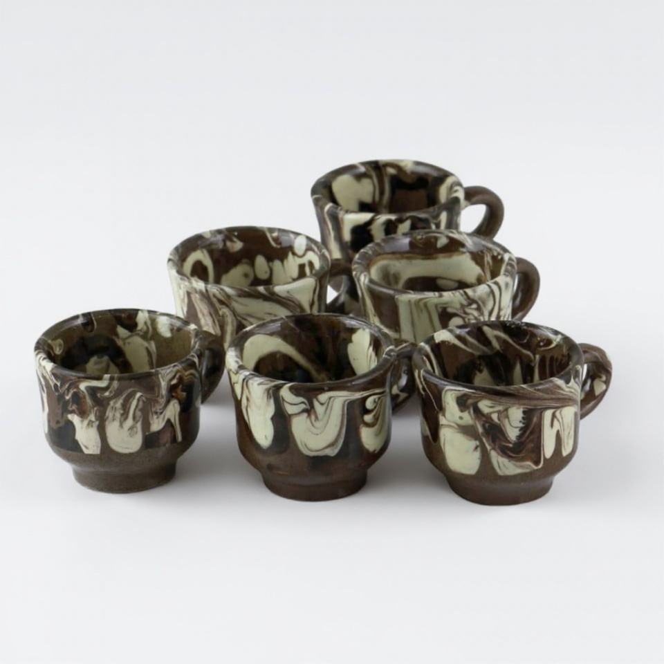 Acest set de 6 canite din lut pentru tuica, glazurate, maro, este realizat manual, pastrand autenticitatea si traditia ceramicii romanesti. Fiecare cana este lucrata in Romania, oferind un design rustic si autentic, ideal pentru servirea tuicii sau altor bauturi traditionale.