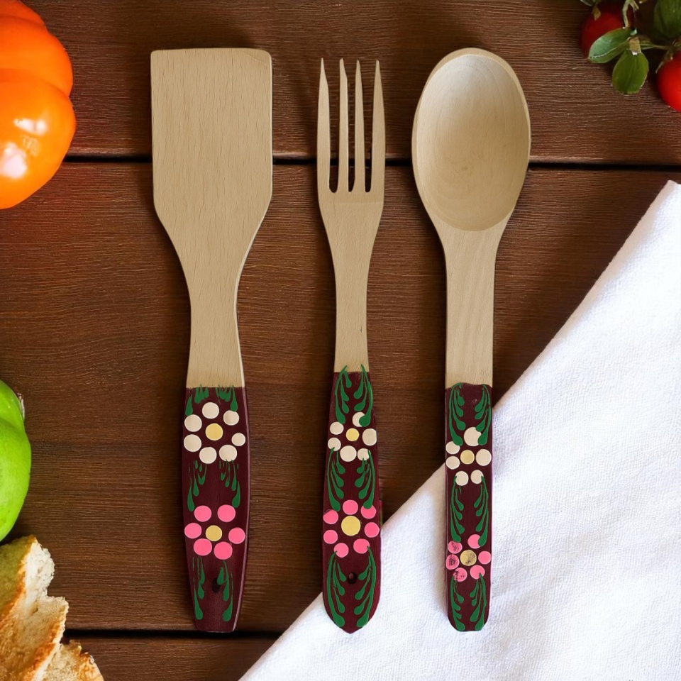 Acest set de 3 ustensile din lemn este ideal pentru gătit și servire, aducând un plus de autenticitate și rafinament bucătăriei tale. Fiecare piesă este realizată din lemn de esență tare și pictată manual cu motive florale tradiționale, conferindu-i un caracter unic.