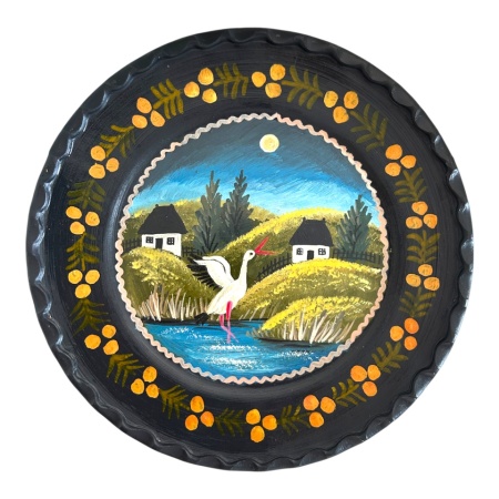Pictura înfățișează un peisaj rustic de vis: două case așezate pe dealuri verzi sau câmpii unduitoare, iar în mijlocul compoziției, în depărtare, se întinde o baltă liniștită, care reflectă cerul senin. În apropierea apei, se distinge silueta unei gâște, adăugând viață și autenticitate scenei. Culorile vii și armonioase, cu nuanțe de verde, albastru și accente calde, conferă farfuriei o notă vibrantă și un farmec aparte.