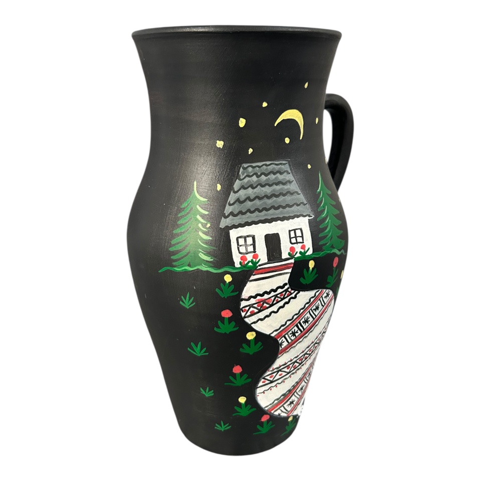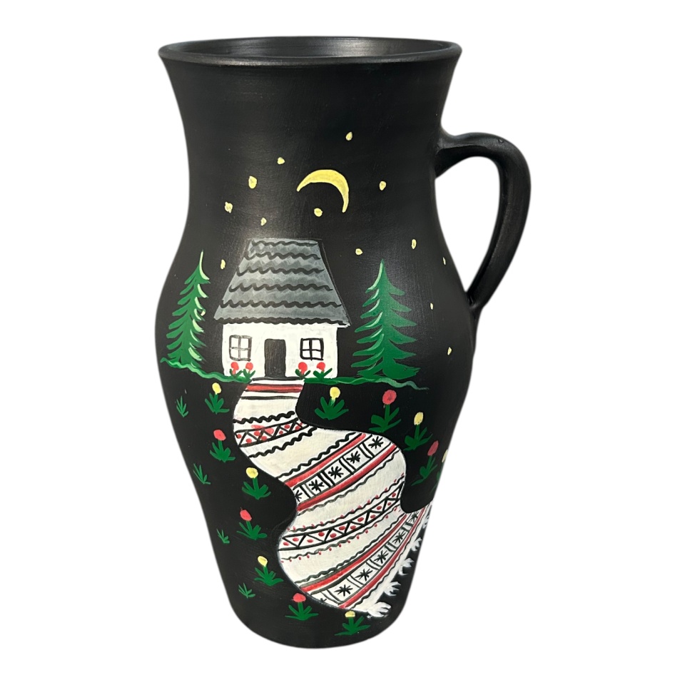 Acest ulcior decorativ de 30 cm este realizat din ceramica autentica in stilul traditional Martinescu Marginea si este pictat manual cu motive inspirate din satul romanesc. Designul prezinta o casa taraneasca luminata de luna si o poteca sub forma unui stergar traditional, decorat cu modele populare realizate manual in culori vii.