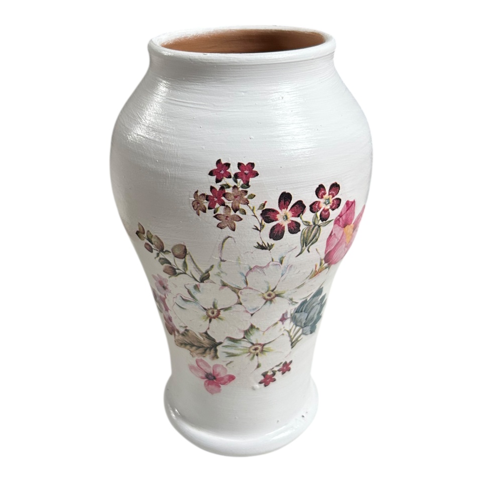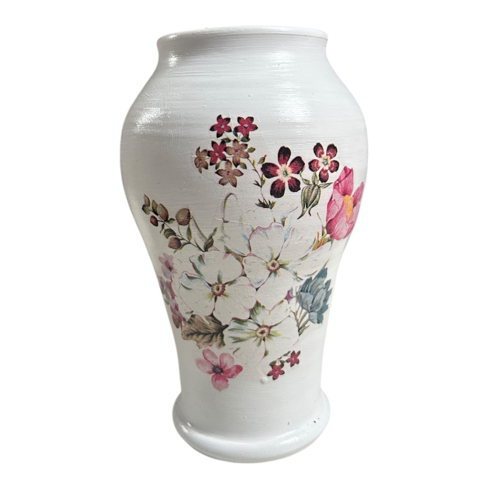 Vaza alba ceramica 20 cm, decorata manual cu buchet de flori, decor floral, artizanat