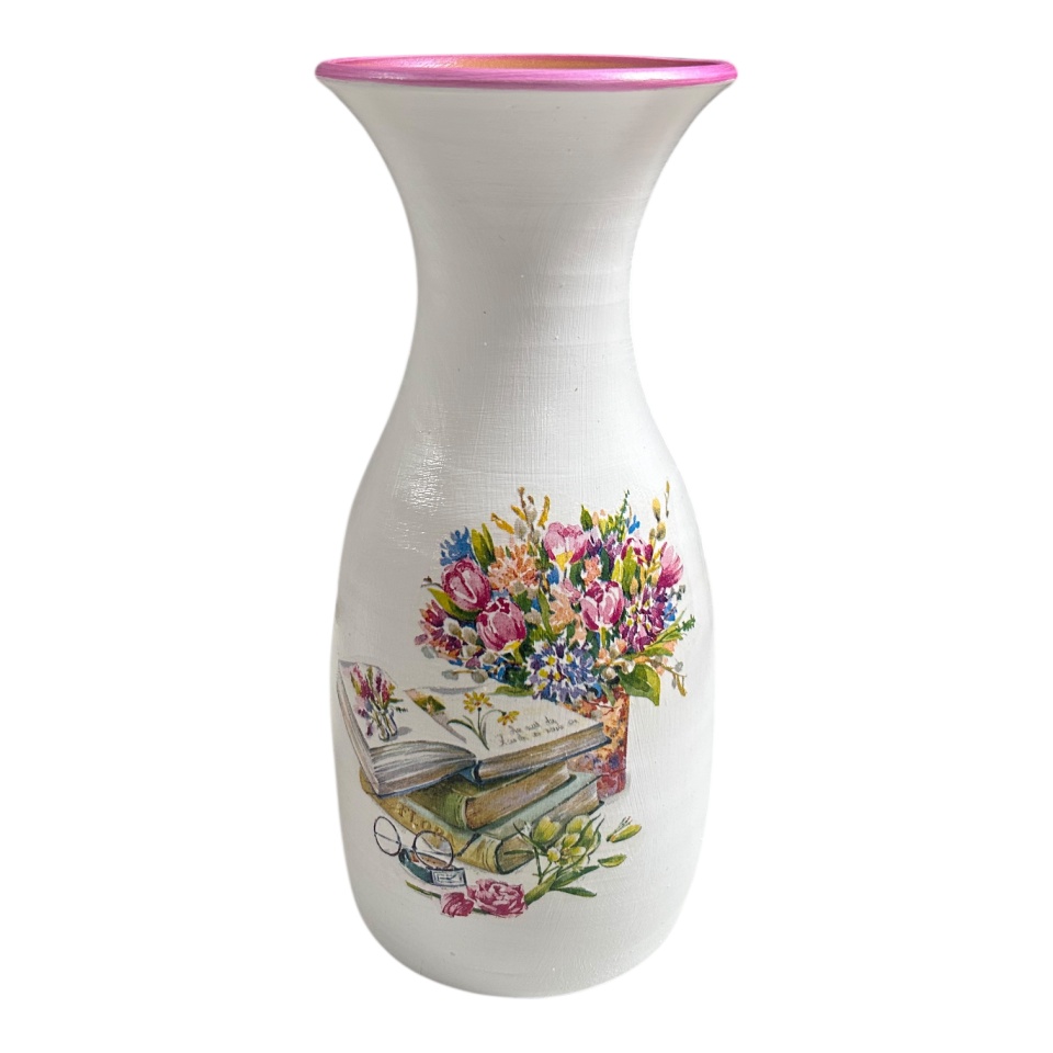Vaza alba ceramica, pictata manual cu buchet de flori si carte, 25 cm, model pentru iubitorii de lectura