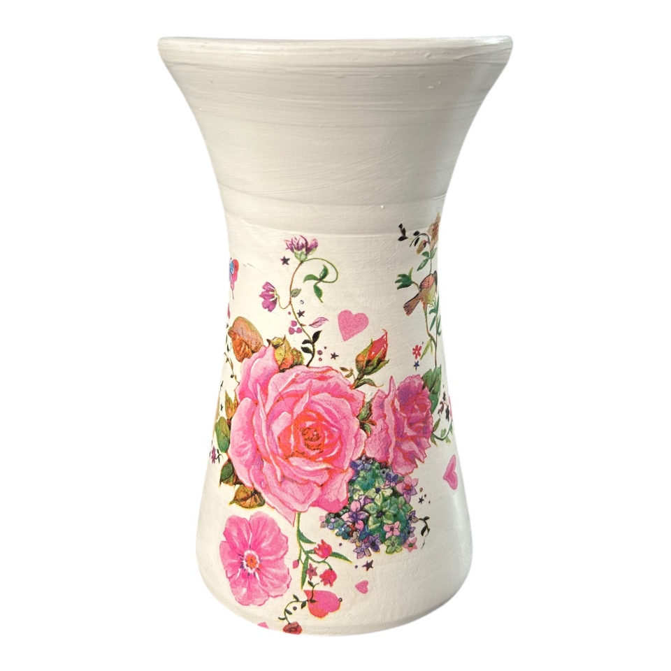 Elegantă și discretă, această vază albă din ceramică este decorată cu un trandafir roz aplicat, oferind un contrast delicat care atrage privirea. Detaliul floral adaugă un aer romantic și cald, ideal pentru interioare feminine, luminoase sau în stil clasic.