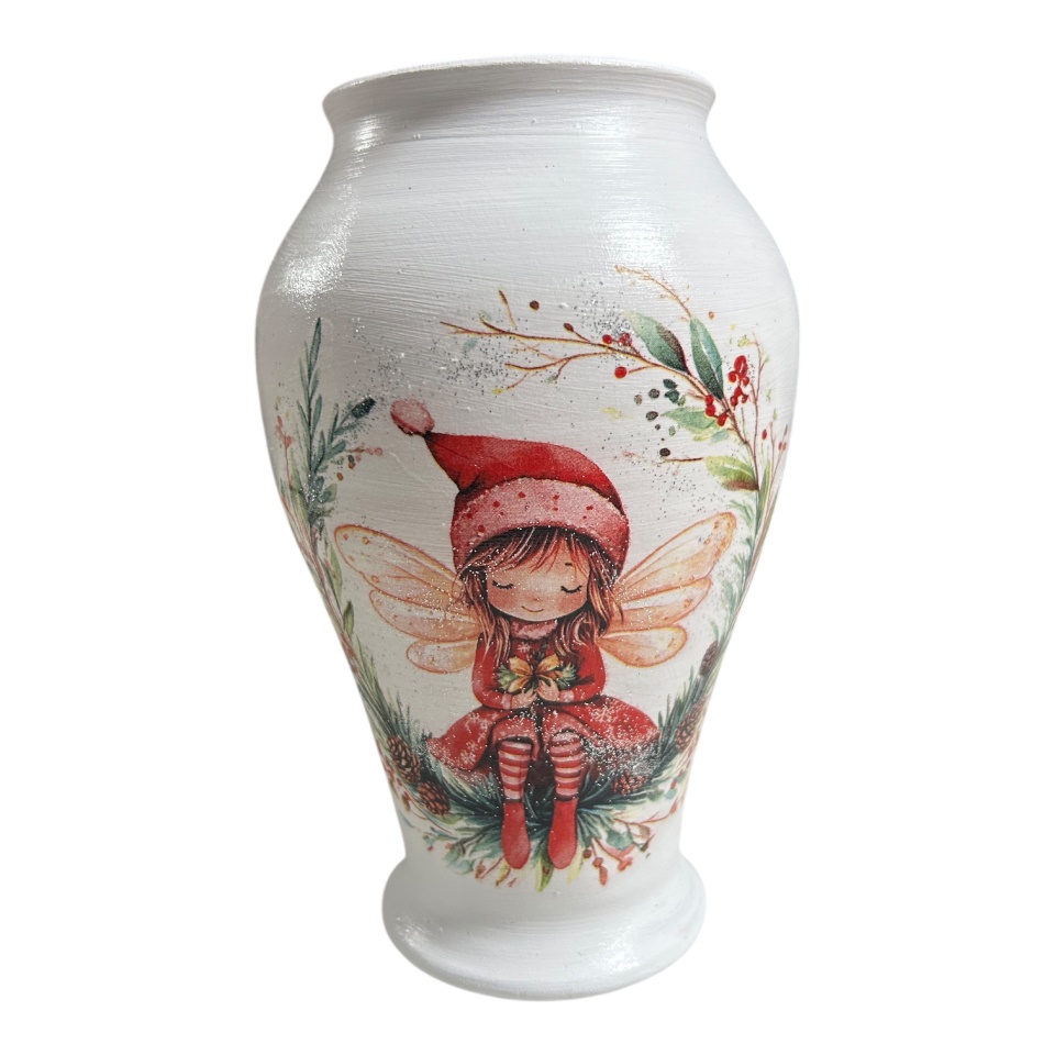 Vaza ceramica 20 cm, decorata manual cu elf de Craciun, decor festiv, artizanat