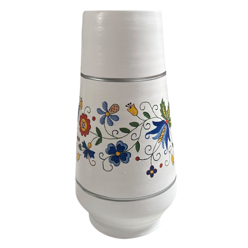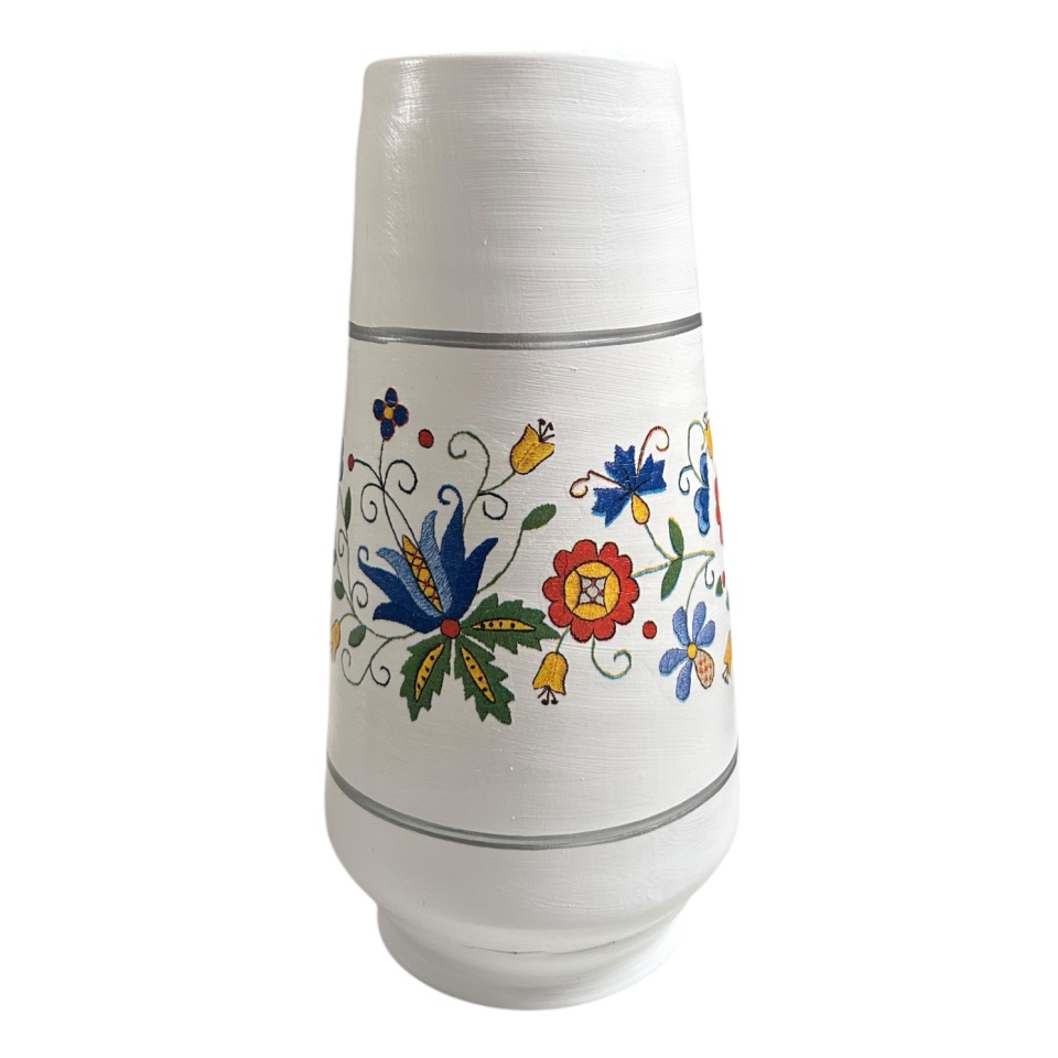 Vaza ceramica de 30 cm decorata manual cu motive traditionale romanesti, fiecare detaliu fiind lucrat cu atentie in atelierul Martinescu. Forma impunatoare si decorul autentic o transforma intr-un obiect central, potrivit pentru orice interior clasic sau rustic. Aceasta piesa artizanala poate fi folosita atat pentru aranjamente florale, cat si ca element decorativ independent, aducand eleganta si caldura spatiului prin frumusetea detaliilor traditionale.