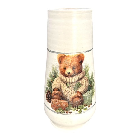 Vaza ceramica 30 cm, decorata manual cu ursulet de Craciun, scena cadouri, decor festiv
