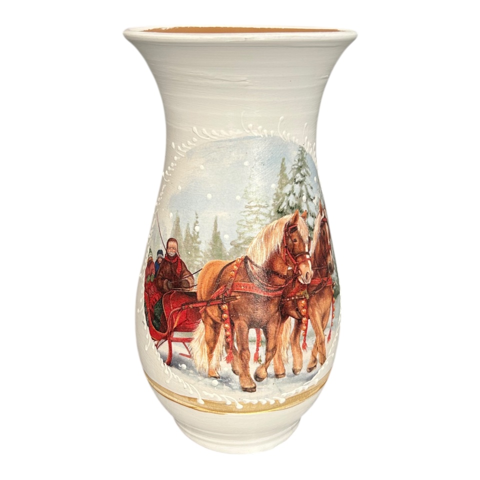 Vază ceramică albă „plimbare cu căruța în zăpadă” – cai, bunic și copii, decor vesel de iarnă