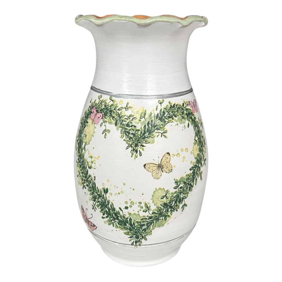Vază ceramică albă 25 cm – inimioară verde și fluturași, decor delicat și vesel