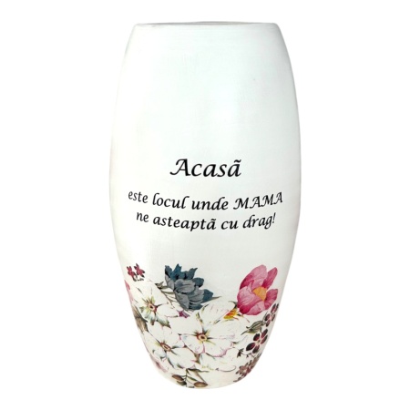 Vază ceramică albă, decorată cu buchet de flori – „Acasă este locul unde mama ne așteaptă cu drag”