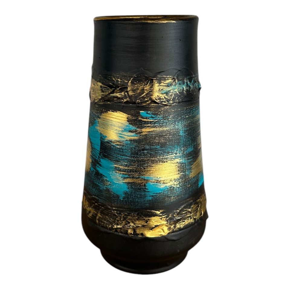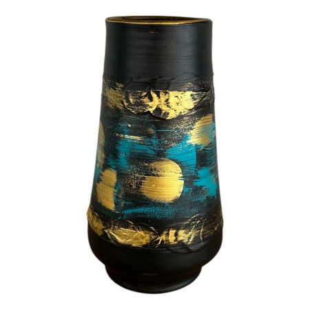 Această vază ceramică unică aduce un aer elegant și artistic oricărui decor. Decorată manual cu detalii aurii și nuanțe pastelate, aceasta este perfectă pentru a completa o atmosferă modernă sau contemporană. Textura stratificată oferă un aspect sofisticat, fiind ideală atât ca piesă decorativă, cât și pentru aranjamente florale. Fiecare piesă este lucrată individual, garantând unicitatea.