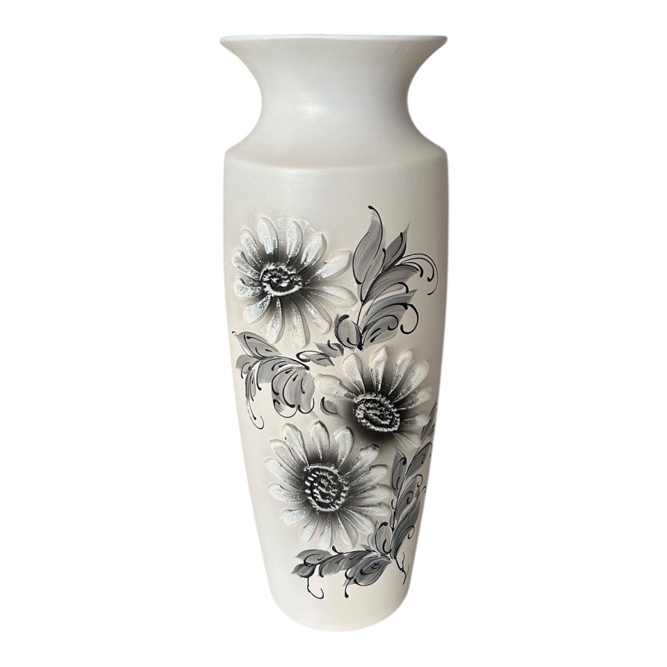 Vaza ceramica inalta 62 cm alb cu gri pictata manual cu flori in relief, decoratiune eleganta pentru living, hol si spatii comerciale