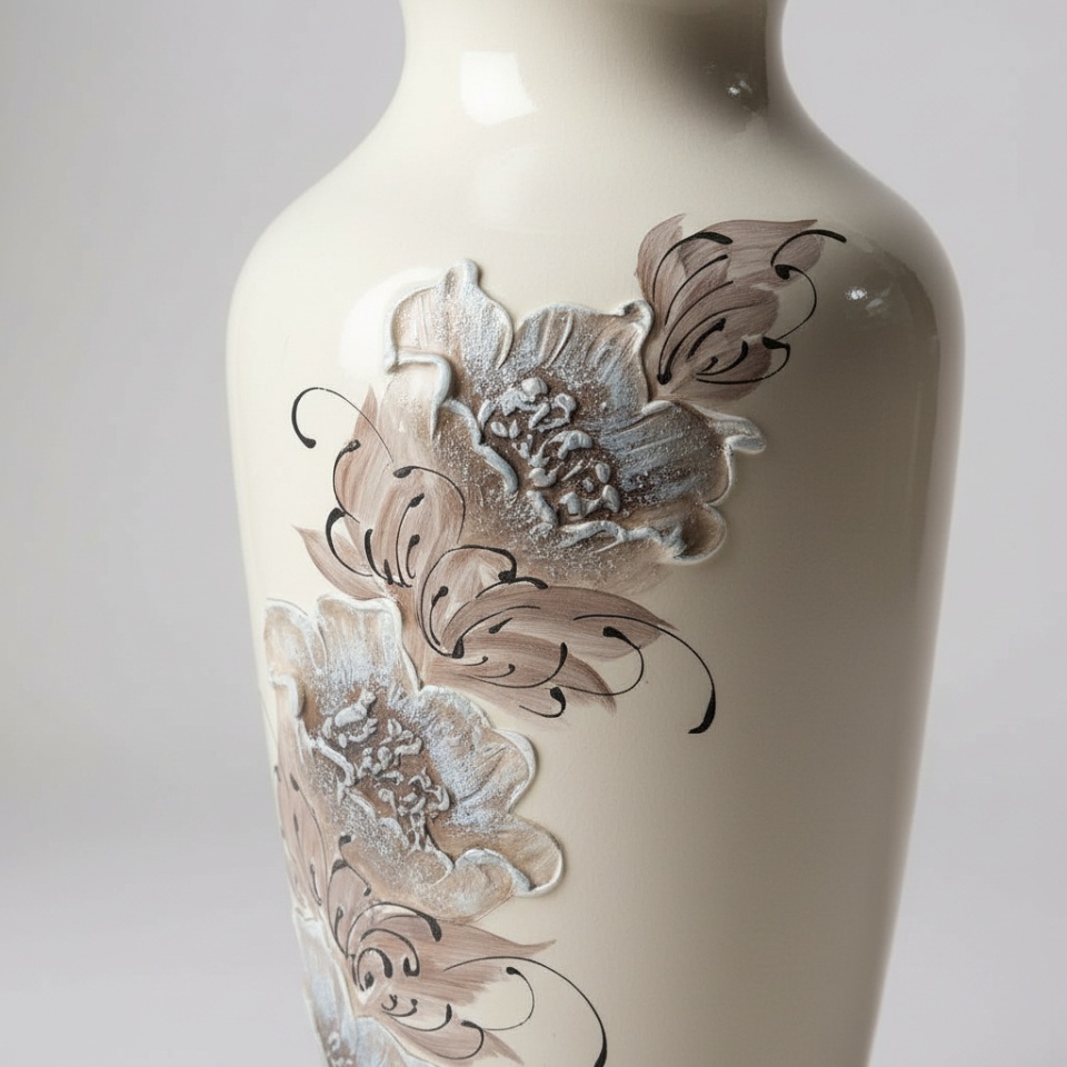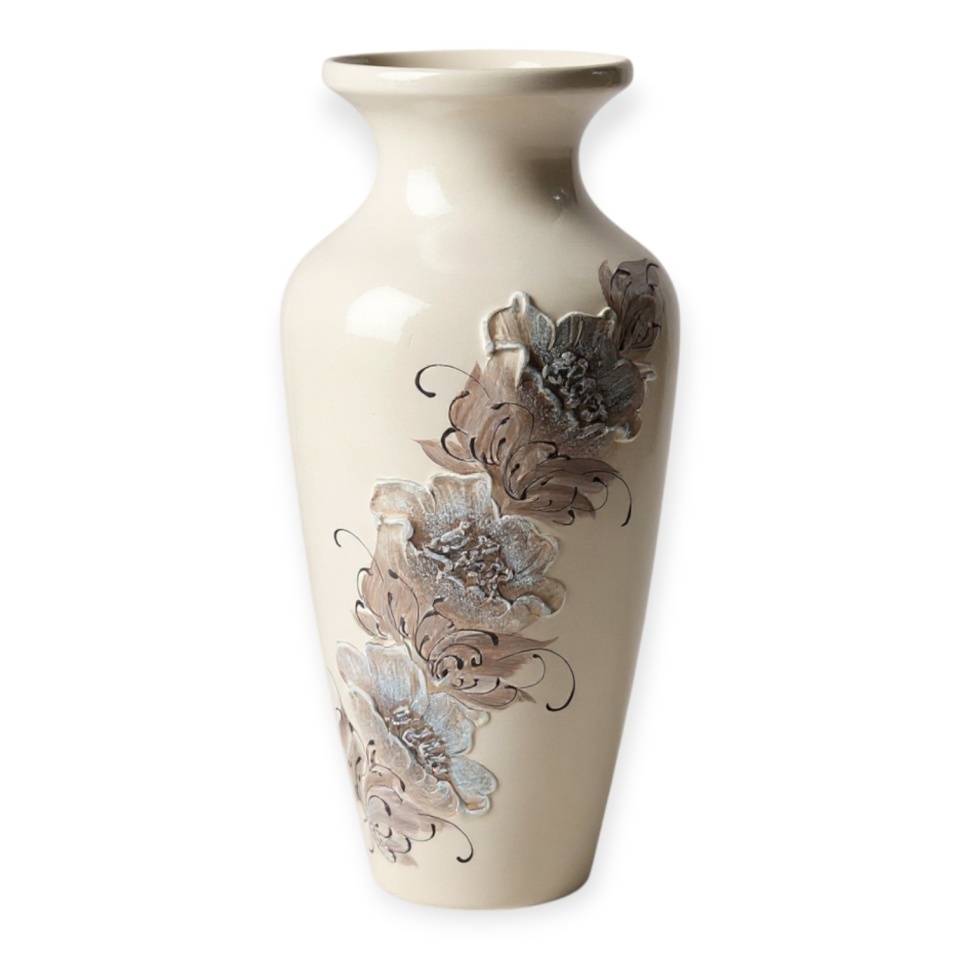 Aceasta vaza din ceramica inalta de 67 cm este o piesa decorativa statement, realizata si decorata integral manual, cu flori in relief pictate manual, fiecare detaliu fiind unic. Finisajul crem / nude o face usor de integrat in decoruri clasice, elegante sau moderne, aducand luminozitate si rafinament spatiului.