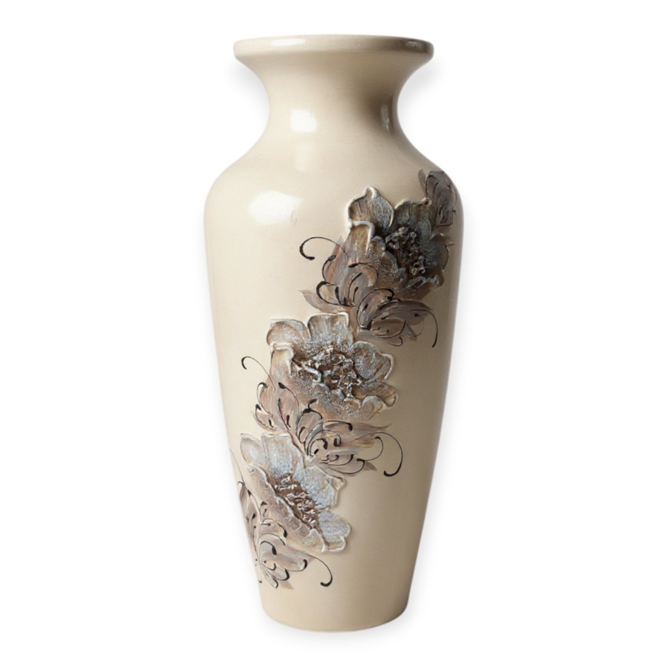 Vaza ceramica inalta 67 cm pictata manual cu flori in relief, decoratiune eleganta crem pentru living, hol sau spatii comerciale