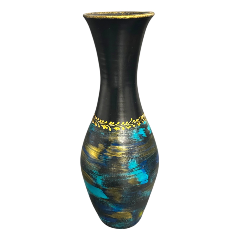 Vază decorativă din ceramică, realizată manual și decorată cu accente aurii și turcoaz pe un fond negru elegant. Cu o înălțime de 40 cm și siluetă înaltă, această piesă oferă o prezență impunătoare și rafinată, fiind perfectă pentru buchete voluminoase sau aranjamente florale elegante. Fiecare vază este unică, datorită decorului aplicat manual, ce conferă un aer modern și sofisticat oricărui spațiu.