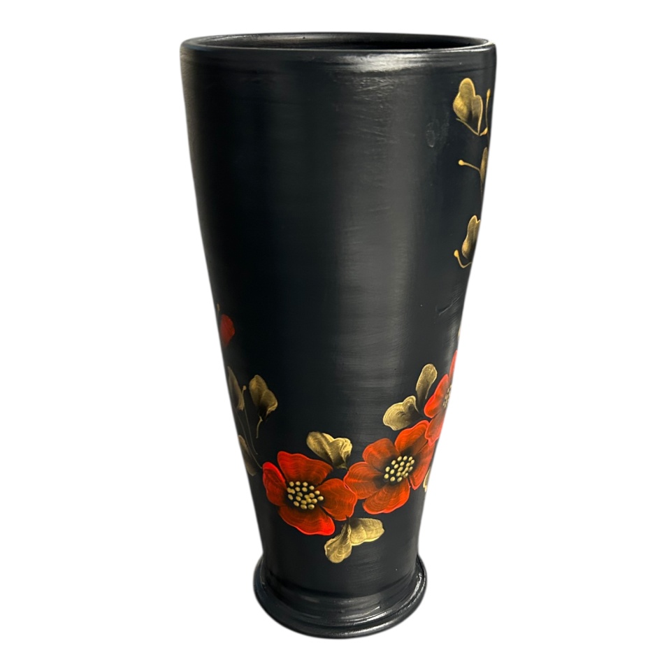 Vază ceramică neagră cu maci roșii și frunze aurii – pictată manual