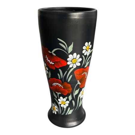 Această vază din ceramică neagră este lucrată manual și pictată cu migală în atelierele Ceramica Marginea. Modelul floral, format din maci roșii și margarete albe aranjate ca un buchet, aduce un aer proaspăt și plin de viață în orice încăpere.
