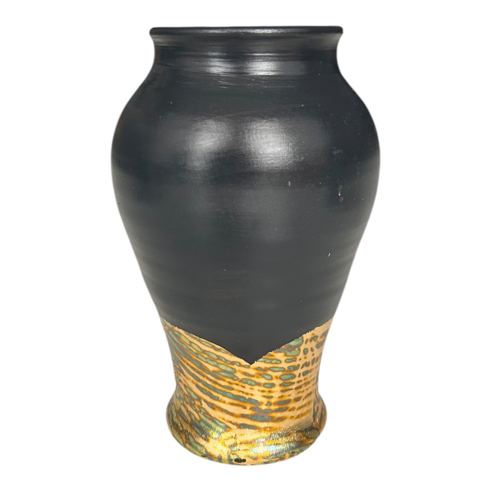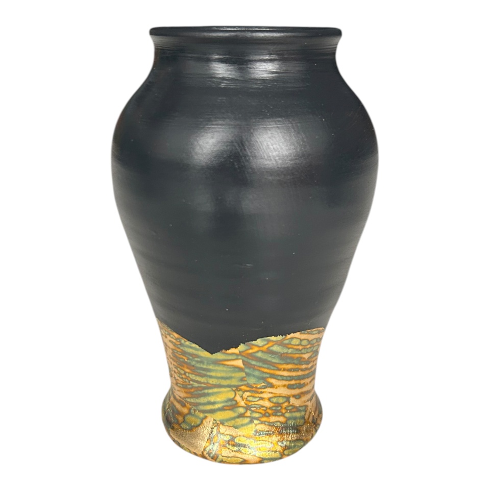 Vază elegantă din ceramică neagră, decorată manual cu foiță de aur aplicată în stil antichizat la bază. Designul sofisticat și contrastul dintre finisajul mat și accentele aurii oferă un aspect luxos, potrivit pentru interioare clasice sau moderne. Ideală pentru flori naturale, uscate sau ca obiect decorativ de sine stătător.
