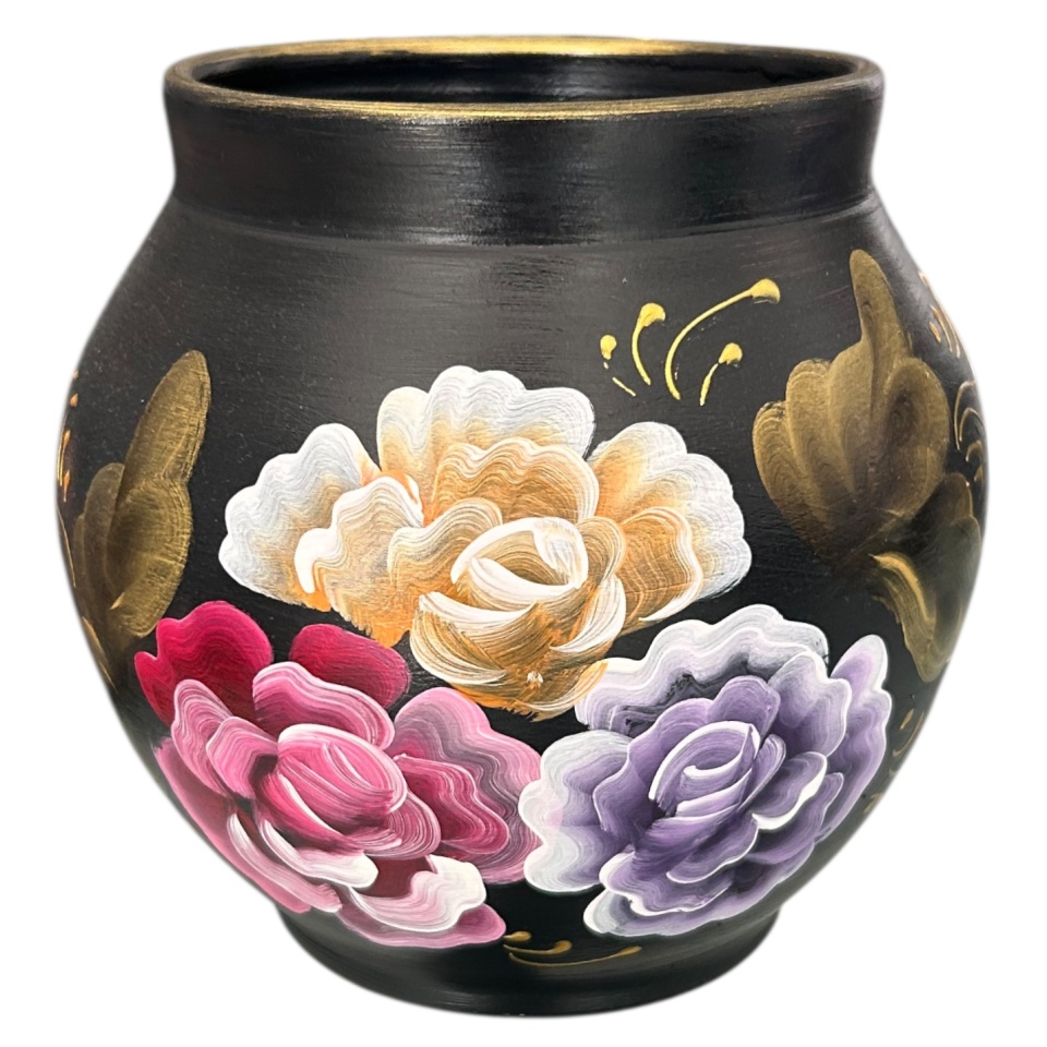 Această vază neagră, cu o formă bombată și dimensiuni de aproximativ 16 cm înălțime și 12 cm lățime, se remarcă prin aspectul compact și echilibrat. Este decorată manual cu un buchet de flori pictate, adăugând un contrast plăcut între fondul închis și desenul floral. Florile sunt redate cu atenție la detalii, oferind vazei un aer decorativ distinct și atrăgător.