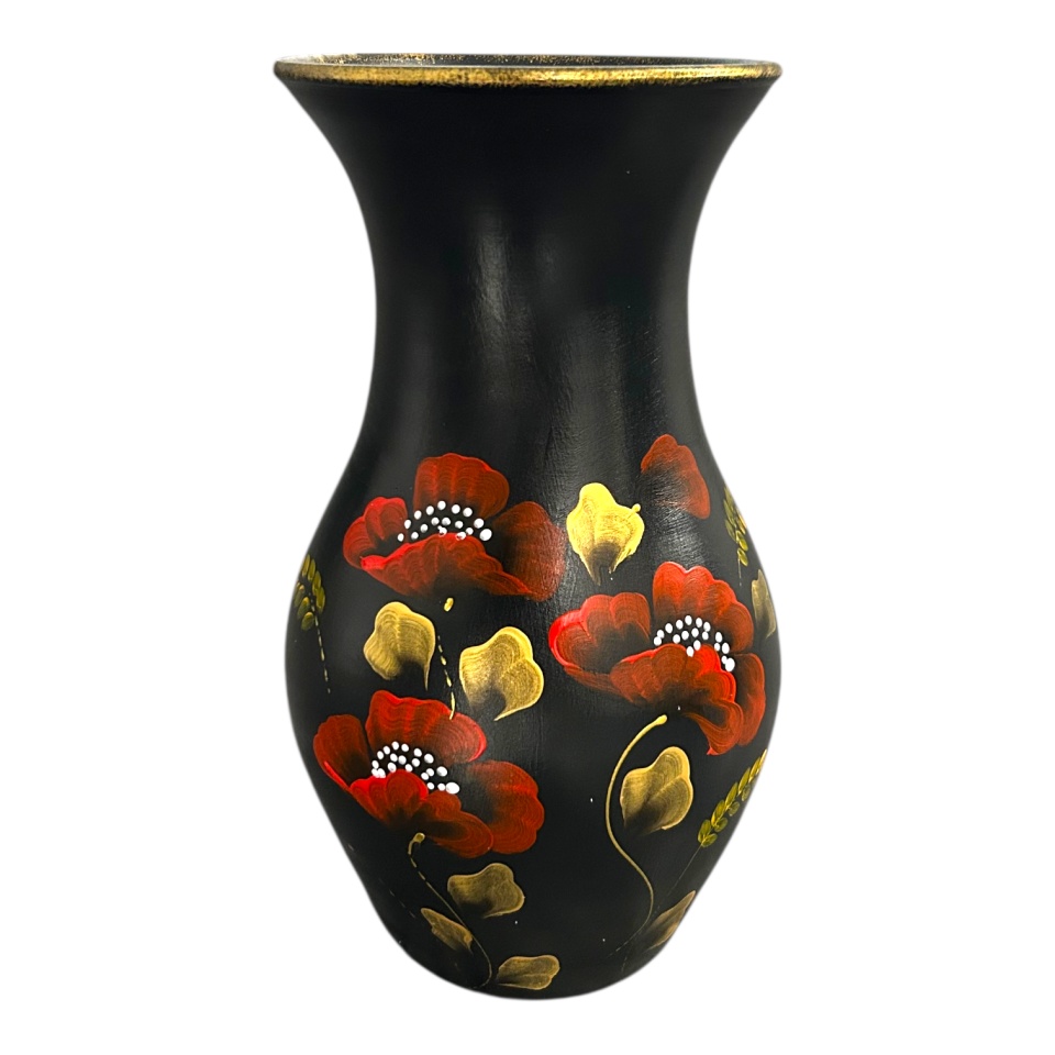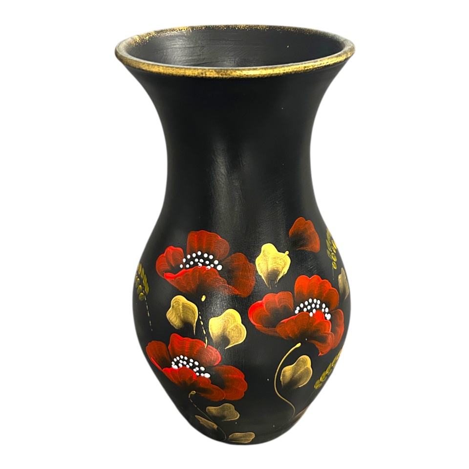 Vază ceramică neagră pictată manual cu maci roșii, 30 cm – Marginea, Bucovina