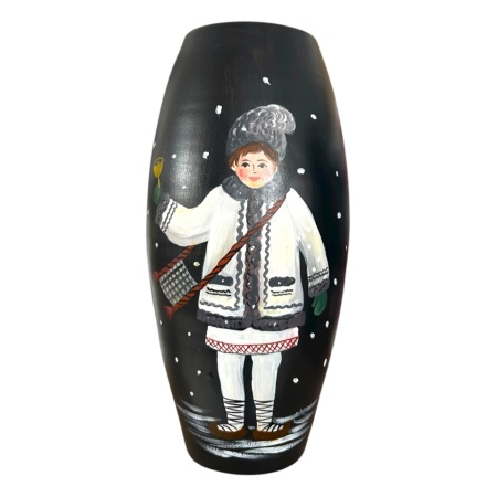 Această vază de 30 cm este lucrată manual și pictată cu migală în atelierul Ceramica Martinescu din Marginea, renumit pentru ceramica neagră bucovineană. Scena surprinde un băiat îmbrăcat de iarnă, purtând cojoc, traistă și clopoțel, mergând la colindat, evocând bucuria sărbătorilor și tradițiile românești autentice.