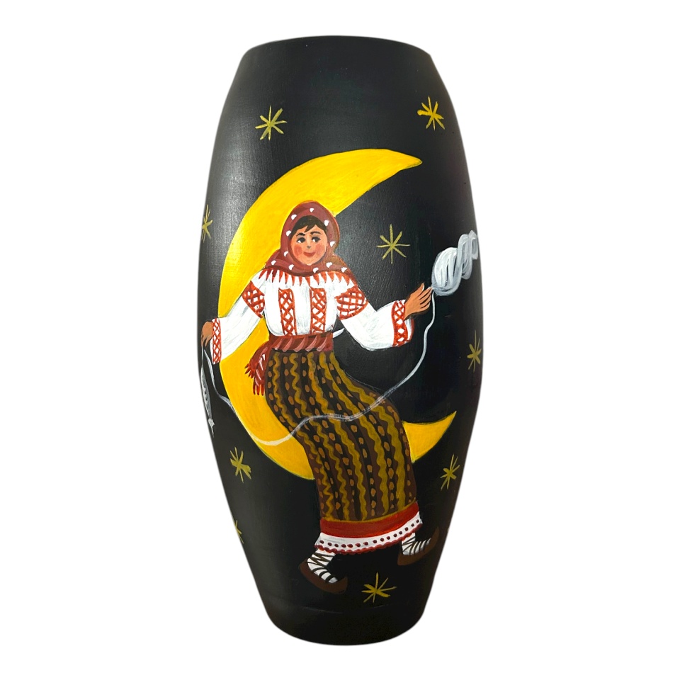 Această vază decorativă de 30 cm este realizată manual în atelierul Ceramica Martinescu din Marginea, renumit pentru tradiția ceramicii negre bucovinene. Modelul redă o scenă autentică din viața satului românesc: o țărancă în costum tradițional, așezată pe o semilună, torcând lână, simbol al muncii și al meșteșugurilor populare transmise din generație în generație.